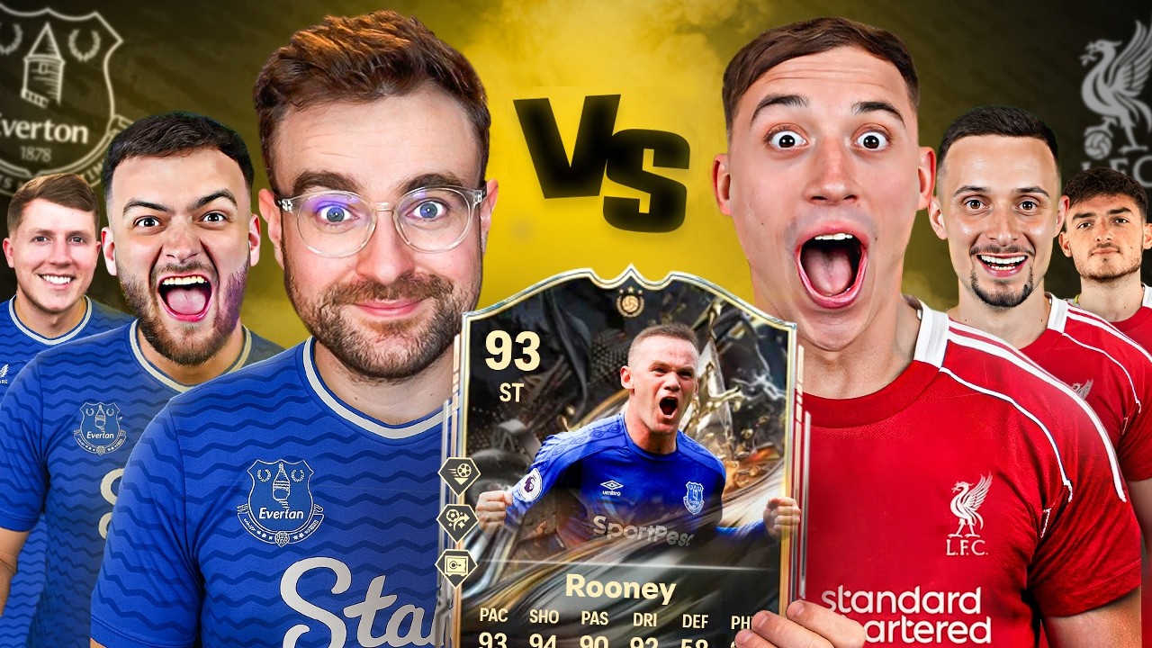 Create a YouTube thumbnail inspired by "3 VS 3 SQUAD BUILDER SHOWDOWN!!! Merseyside Derby Special". Make it vibrant, high-contrast, and attention-grabbing at small sizes.