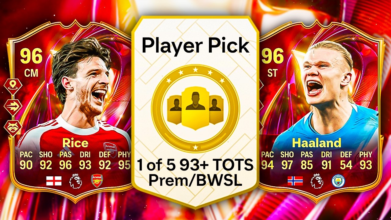 Create a YouTube thumbnail inspired by "93+ PREM/BWSL TOTS PLAYER PICKS! 😨 FC 26 Ultimate Team". Make it vibrant, high-contrast, and attention-grabbing at small sizes.