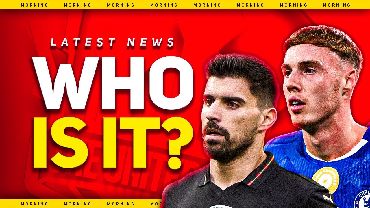 Create a YouTube thumbnail inspired by "Carrick's TRANSFER Target! Neves, Palmer, Ndidi Latest! Man Utd Transfer News". Make it vibrant, high-contrast, and attention-grabbing at small sizes.
