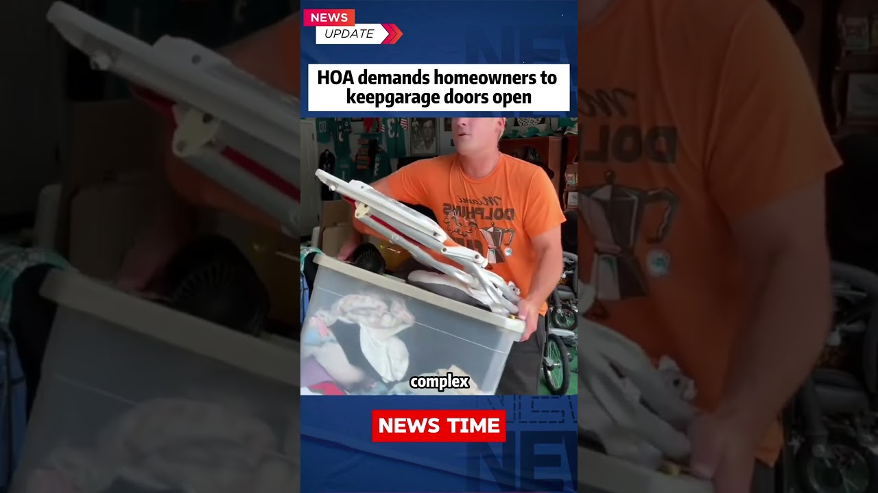 Create a YouTube thumbnail inspired by "HOA demands homeowners to keep garage doors open #news #shorts". Make it vibrant, high-contrast, and attention-grabbing at small sizes.