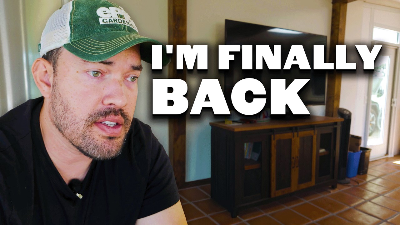 Create a YouTube thumbnail inspired by "I'm Back At The Homestead After 3 Weeks Abroad!". Make it vibrant, high-contrast, and attention-grabbing at small sizes.