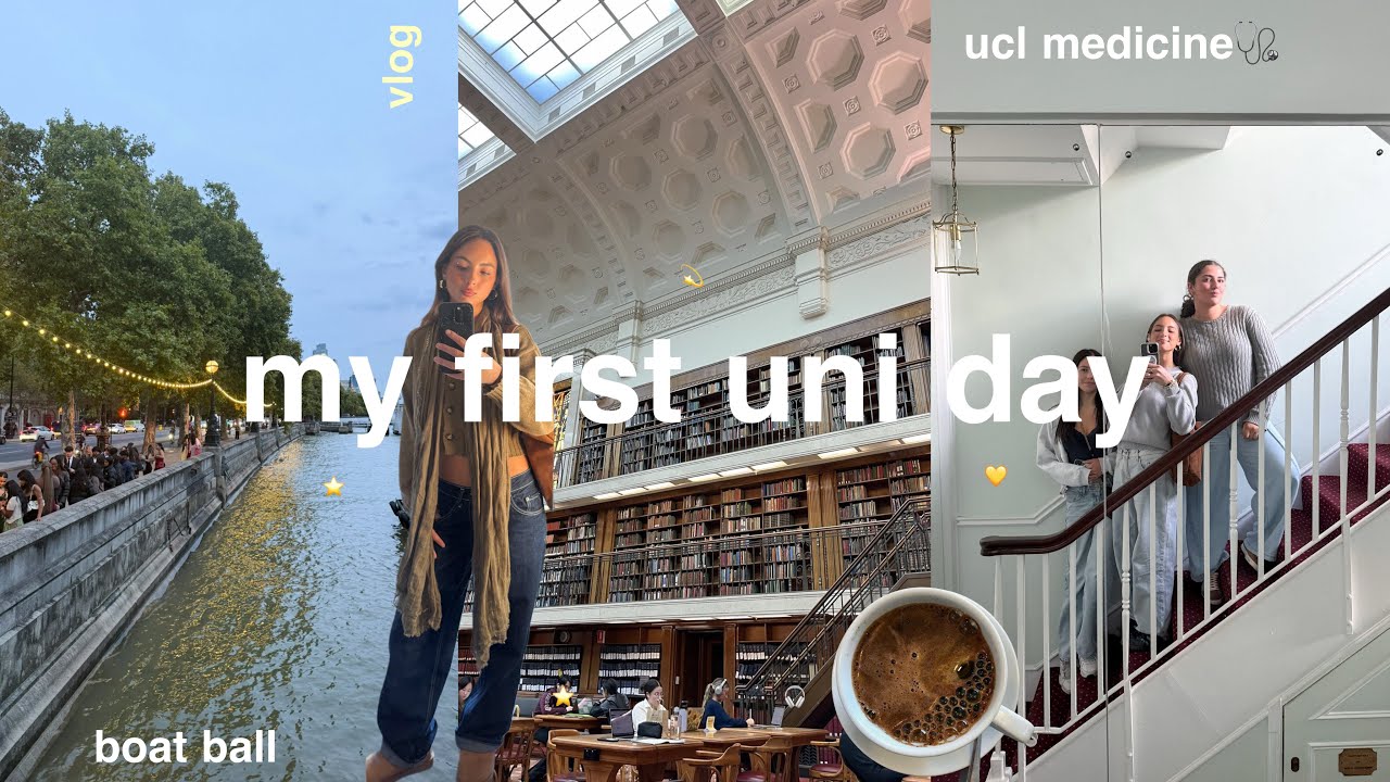 Create a YouTube thumbnail inspired by "my first day studying medicine at uni | UCL edition 🩺". Make it vibrant, high-contrast, and attention-grabbing at small sizes.