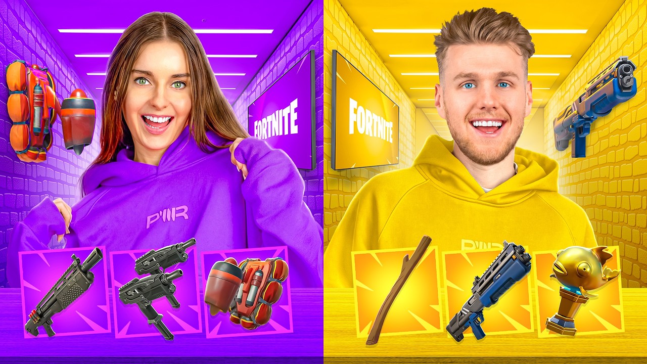 Create a YouTube thumbnail inspired by "Outfit = Fortnite Loadout!". Make it vibrant, high-contrast, and attention-grabbing at small sizes.