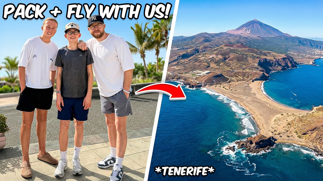 Create a YouTube thumbnail inspired by "PACK + FLY WITH US TO THE ISLAND OF TENERIFE 🇪🇸". Make it vibrant, high-contrast, and attention-grabbing at small sizes.