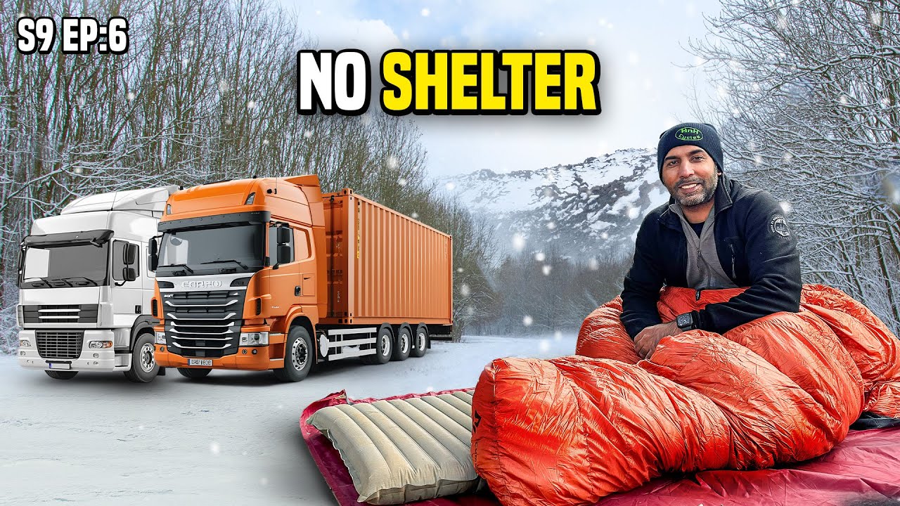 Create a YouTube thumbnail inspired by "RESCUED by Truck Drivers in Cold and Rainy Alaska S9 EP 06 | Pakistan to Americas Motorcycle". Make it vibrant, high-contrast, and attention-grabbing at small sizes.