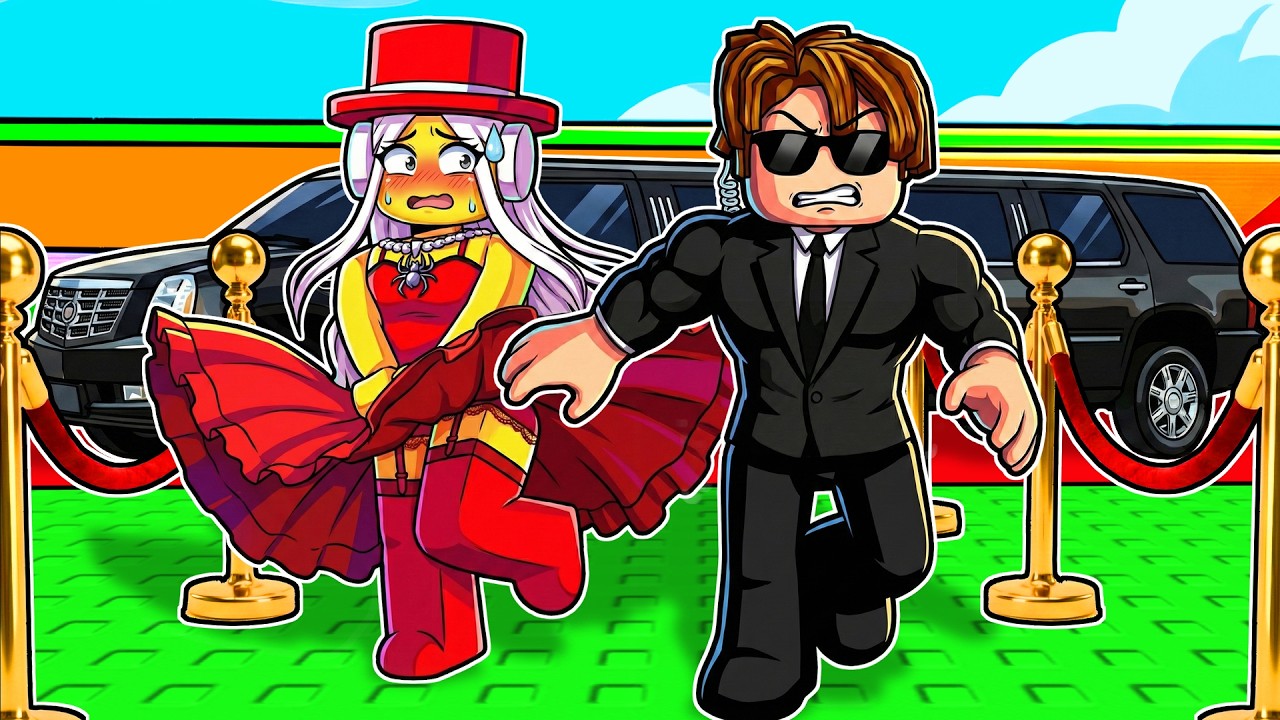 Create a YouTube thumbnail inspired by "She Hired Body Guards To Protect Her In Roblox". Make it vibrant, high-contrast, and attention-grabbing at small sizes.